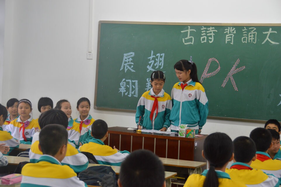 2014年11月7日上午,正是附小的家长开放日,在附小教学楼四楼六(3)班的教室里,不时传来阵阵的喝彩声和欢呼声,哦!原来这里正进行着由语文兼班主任谭老师组织的,以“ 展翅翱翔 PK 勇夺桂冠”为主题的古诗背诵大赛。此次比赛不仅体现了传统文化进课堂的国学教育,还为学生提供了良好的平台,