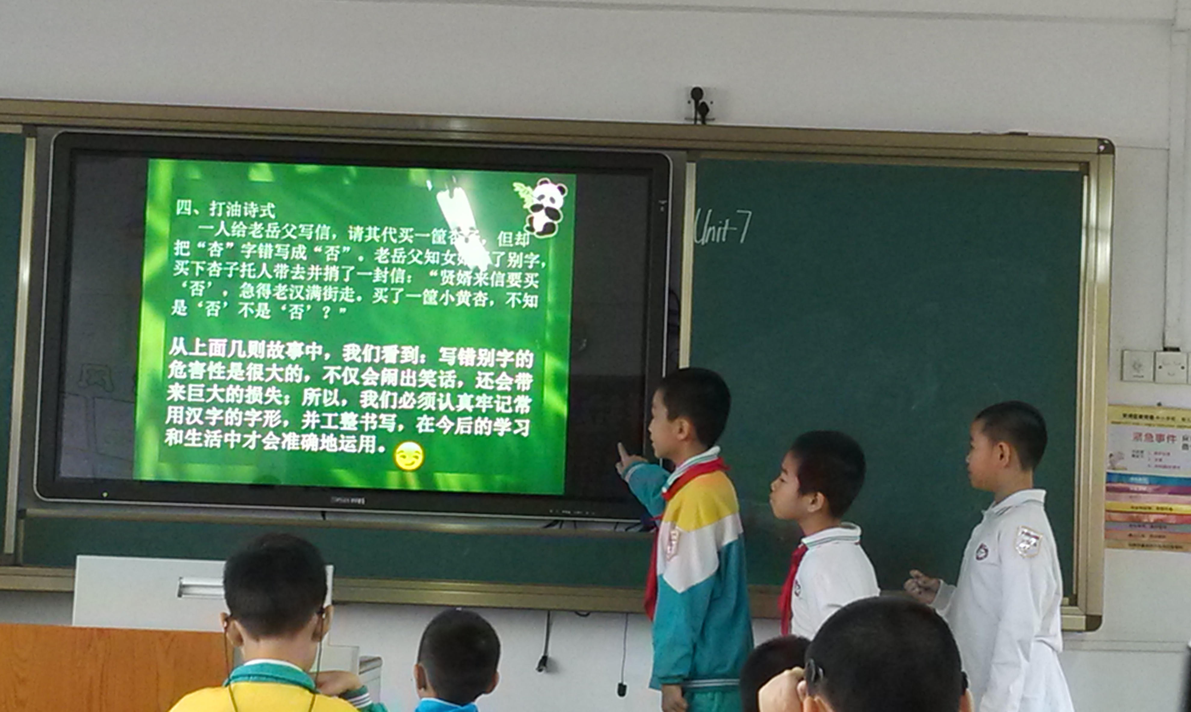 语文课,陈老师让同学们分小组准备了PPT演讲稿,为家长们揭开汉字王国的奥秘。每小组同学都分工合作:有认真地搜寻资料的,有努力学做PPT的……在课堂上,同学们一起配合给家长们作讲解……在增长知识的同时,也增强了孩子们相互间的合作性。