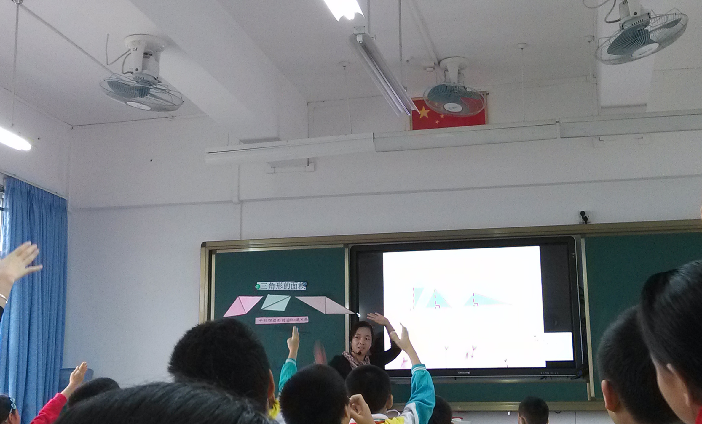 数学课,方老师把枯燥的数学讲得非常生动有趣,三角形拼四边形,边玩、边教、边学,孩子们都乐在其中,积极地举手发言、上台演算,课堂气氛十分活跃。