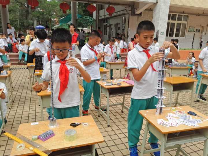 在附小门厅,学生分批进行了“纸飞机竞赛”、“纸牌建高塔竞赛”、“纸桥承重竞赛”。孩子们积极开动脑筋,创造出一个又一个令人惊叹的作品.