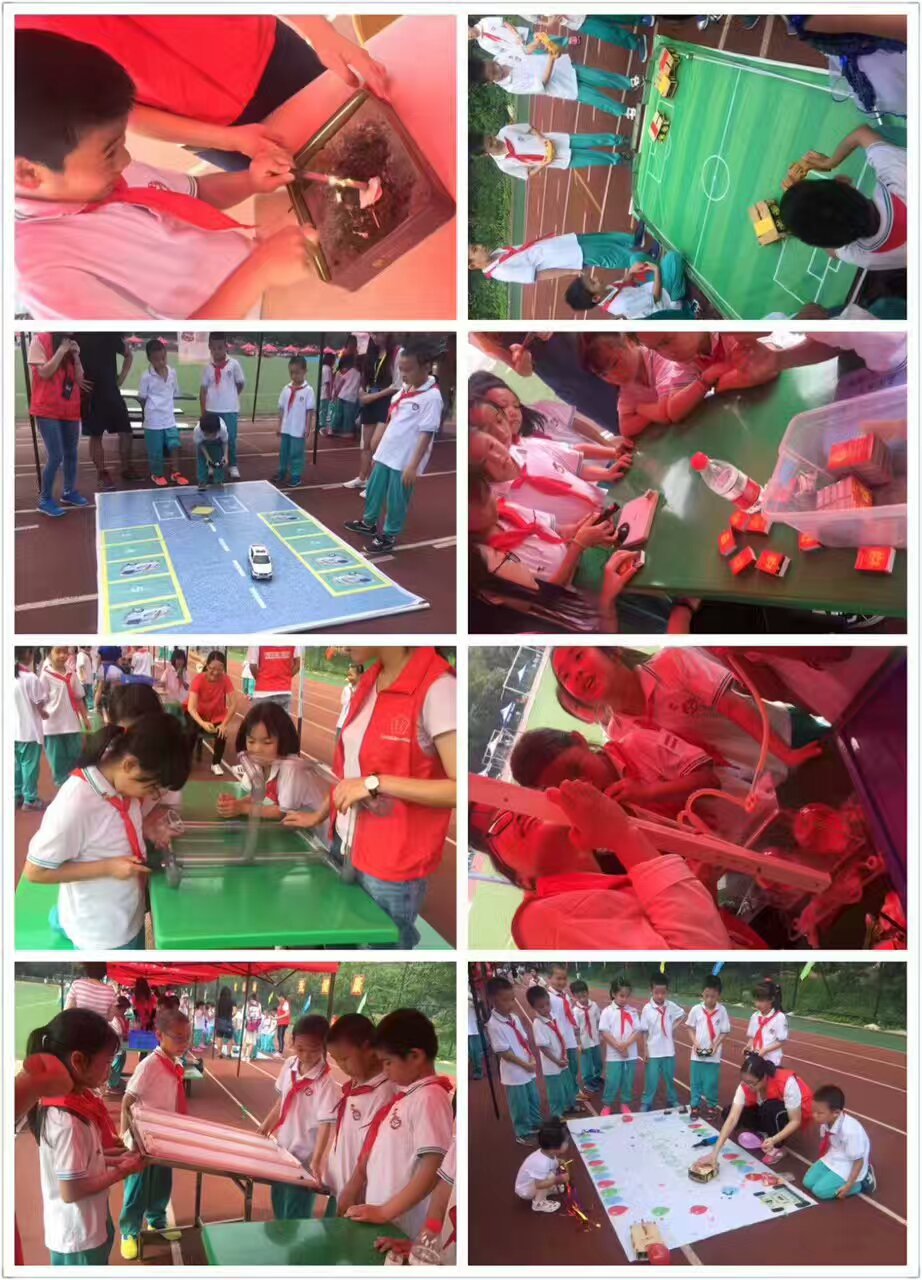 上午九时,科技节活动正式开始了。本次活动有两大看点:一是在六一区操场开展的科技体验活动;二是在附小门厅举行的科学比赛活动。