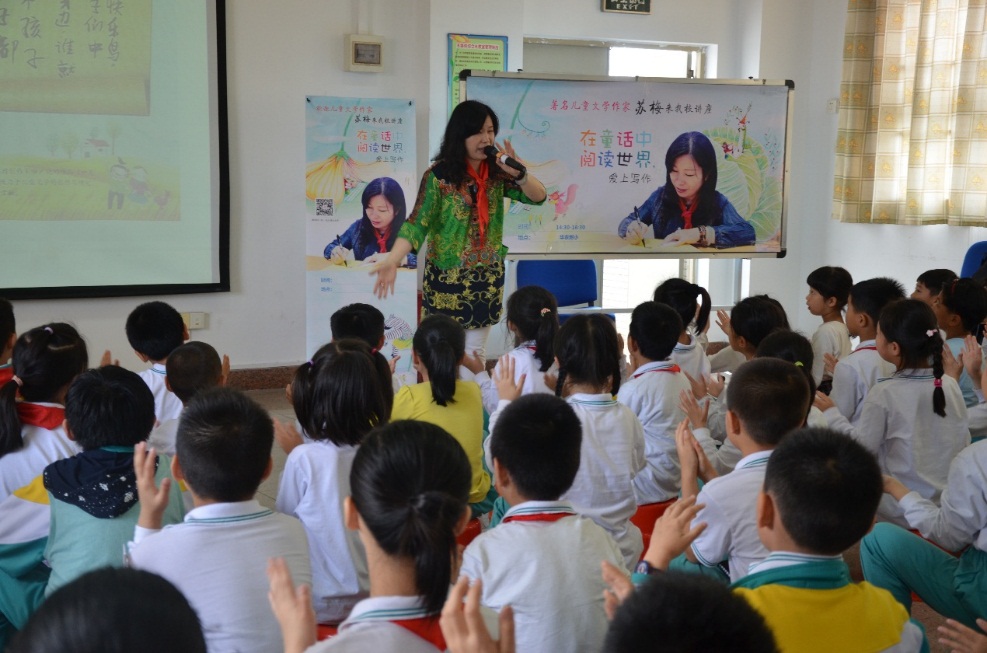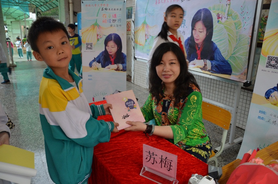 为营造校园读书氛围,激发师生读书热情,形成校园内热爱读书的良好风气,我校在四月份开展了以“与好书交友,我与作家有个约会”为主题的“悦读大本营”活动。2017年4月26日下午作家苏梅给我校学生进行爱阅读讲座,并进行签售活动。