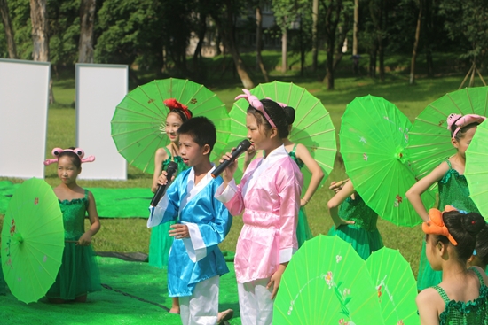 其中,来自广州市黄浦区下沙小学的同学们以一曲生动活泼的《江南》吸引了众多观众的注意。他们穿着代表莲叶的绿色表演服,头戴螃蟹、小鱼等池塘生物头饰,唱唱跳跳,分外可爱。参与了本次表演的杨裕欢同学说:“把诗歌唱出来更能抒发情感,比起呆呆的朗诵,这更能表达我们对诗歌的喜爱。”