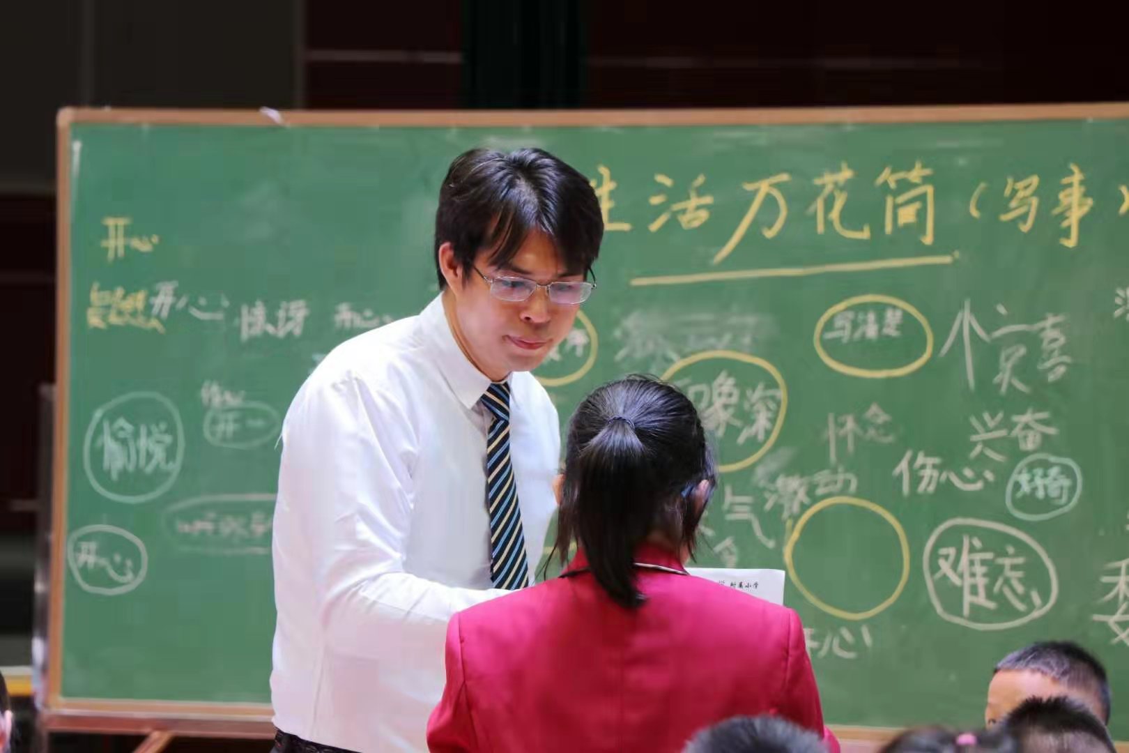 课堂展示环节精彩纷呈。第一节是习作指导课《生活万花筒》。毛任州老师是附小的骨干教师,也是天河区名教师。配合他上课的班级是华农附小四年2班的同学们。学生写作的难点之一在于选材,幽默风趣的毛老师立足于教材,从“万”字打开学生选材的思路,让学生自己到黑板上展示自己的想法,在课堂上给了学生充分的题材选择余地,然后回顾单元课文和习作例文,巧妙地引导学生思考,提炼写作方法,教会学生如何“按一定顺序写清楚”,最后结合例题引导学生定一个好题目。学生在毛老师引领下,沉浸在课堂的学习中,兴味盎然。
