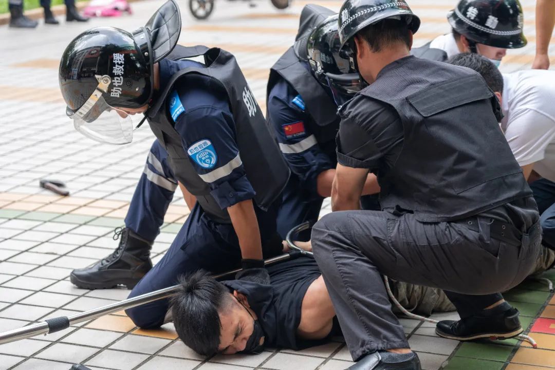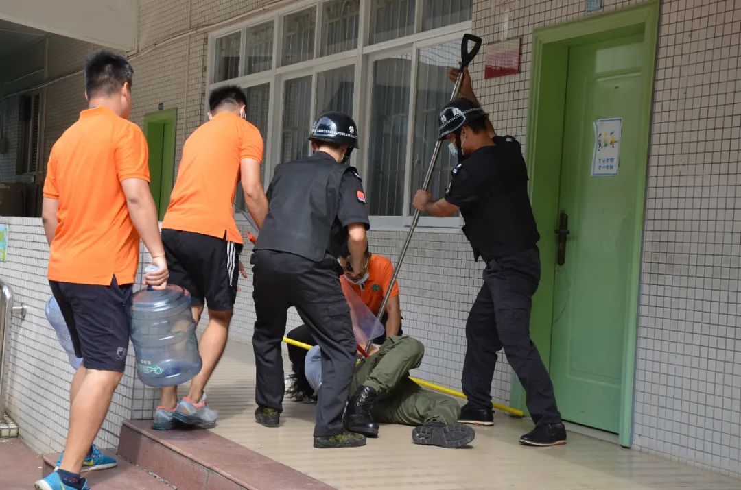 在大家松一口气的时候,危险并未远离,另一名“歹徒”趁乱翻墙入校,闯到一年(2)班课室前。幸好该班的师生都接受过防暴教育,懂得关窗合帘、把门口堵住,安保人员也迅速到位,大家在课室外制服了这名“歹徒”。
