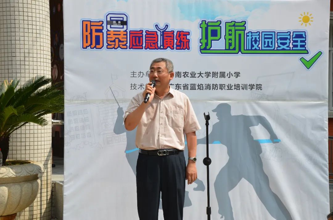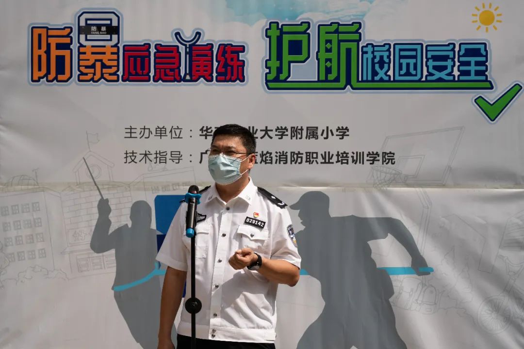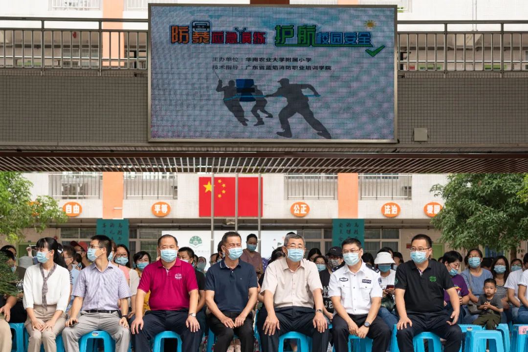 本次演练得到各方的大力支持,华南农业大学杨运东副校长、五山街派出所徐志诚所长、附小法制副校长陈东斌警官、五山街综治办陈均洪主任、校工会覃枝安常务副主席、校保卫处龙新望处长、校工会梁艳萍专职副主席、以及来自华农社区居委、兄弟学校等各单位的领导、附小家委出席了本次活动。