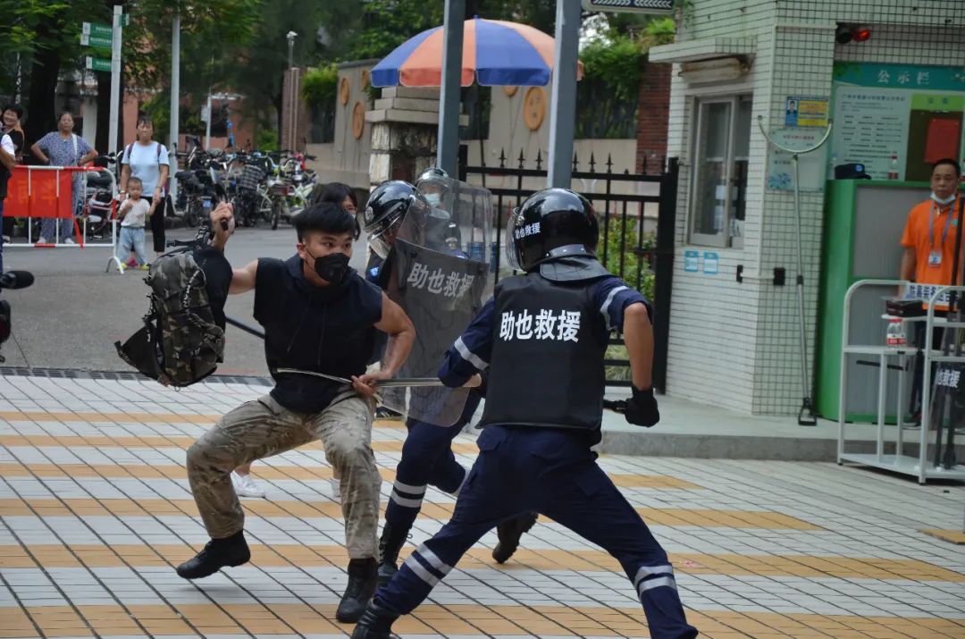 演练当天,孩子们入校门之时,一名蒙面“歹徒”手持“凶器”准备发难,情况十分危急。值班教师和保安第一时间发现险情,数秒内按响了一键报警系统,学校迅速启动防暴应急处置。经过一轮搏斗,在保安和教师的共同努力下,这名“歹徒”被制服于校门口。
