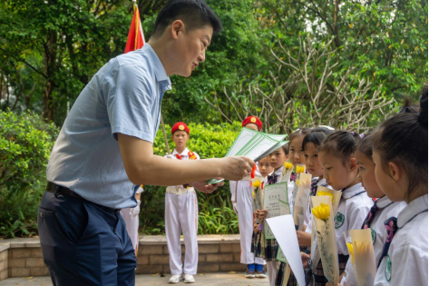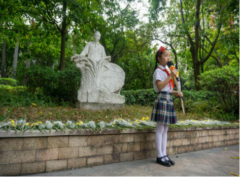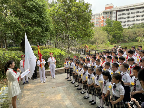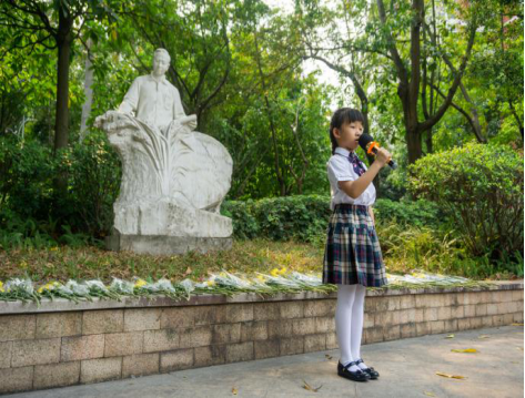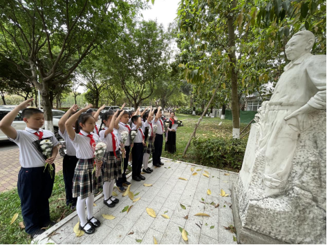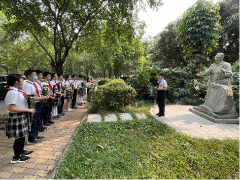 在卢永根院士纪念像前,大队辅导员姚美玲老师带领大家唱队歌,随后各年级分别到指定纪念像前开展祭扫活动。