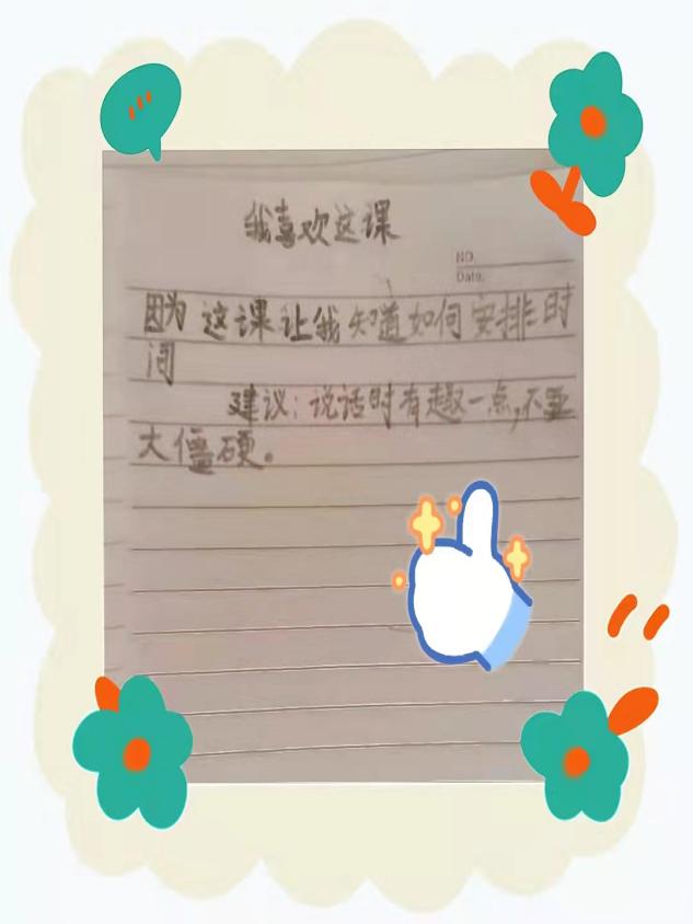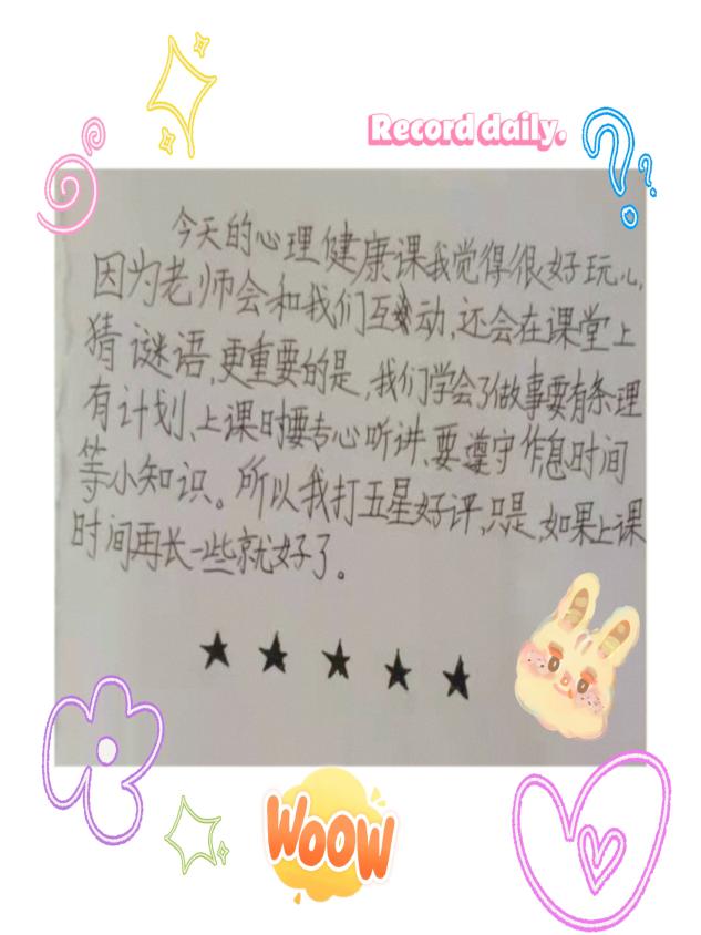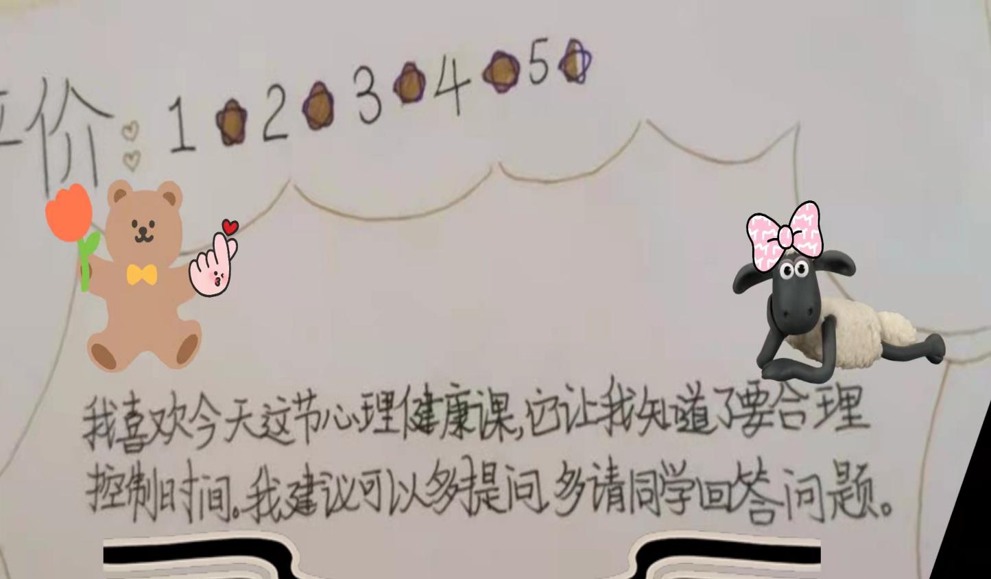 第一次给学生们上心理健康课,能够给学生们带来欢乐就是最大的成功与收获了,就像指导老师们所说,让学生们感觉到这门心理健康课与其它课程是不一样的,不一样的上课氛围,不一样的上课方式,孩子们能够学到关于心理健康的一些小知识就是上课的首要目标,课后收集到的学生们的建议以及老师们的指导在后面的课程当中会做出改善。