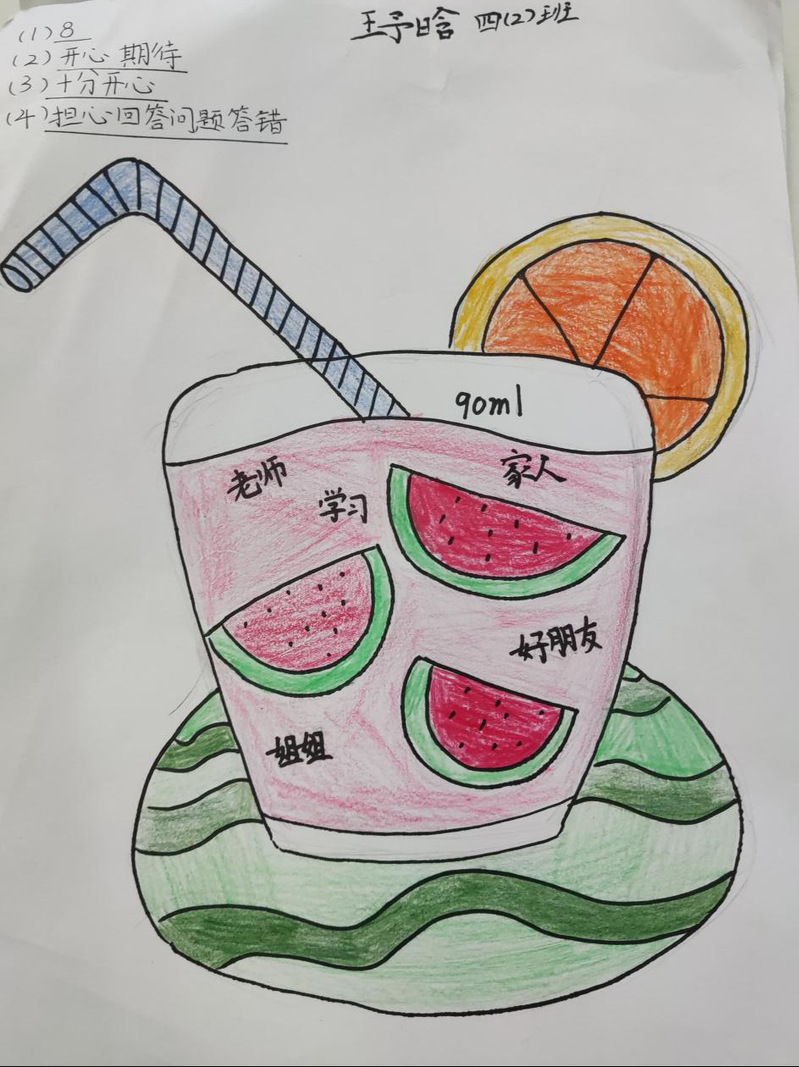 最后,陈老师带着大家定制属于自己的“开学能量杯”,同学们根据自己的喜好、开学心情、对开学的期待来定制自己的“开学能量杯”。同学们的“开学能量杯”创意十足的同时又如实地表达出了自己的期待,可能会认识更多的新朋友,期待着上心理健康课,展望了未来新学期里的校园生活。