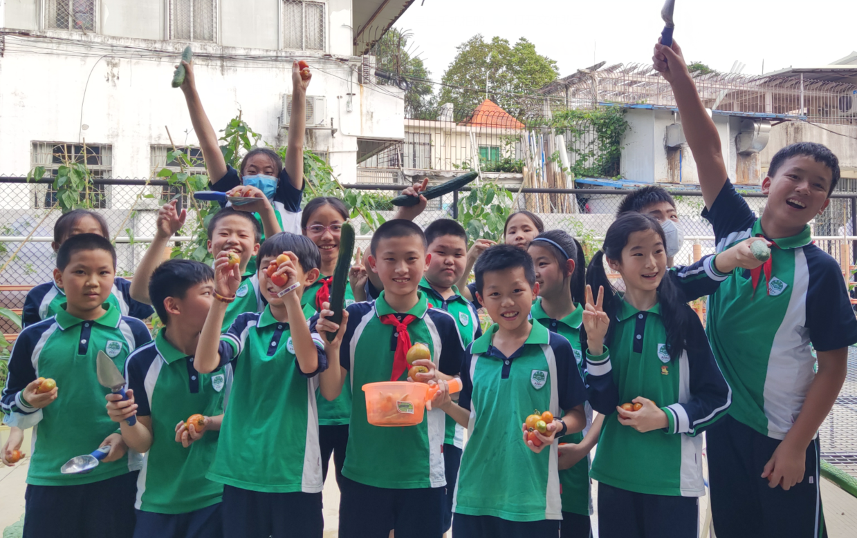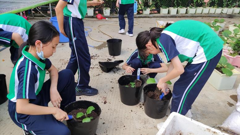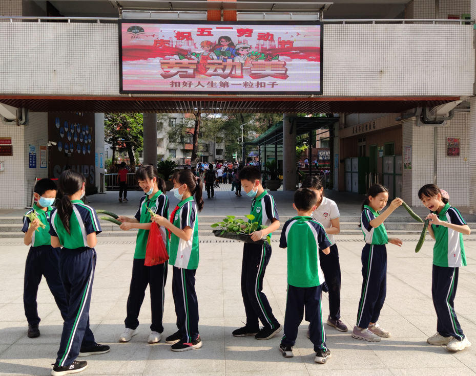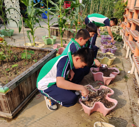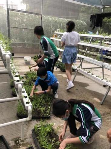除了组织学生在家参加劳动,学校也在假前组织了校内劳动项目,如育苗、为蔬果除草捉虫子、种茄子、收获蔬菜......学生在劳动基地分小组完成任务,体验劳动的甘苦,体会粮食的来之不易。