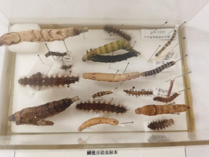 在展的昆虫标本,都是团队精挑细选后制作成标本的,每个标本都有自己的故事:其中一盒鳞翅目幼虫标本由吹涨的方法制成。