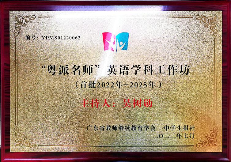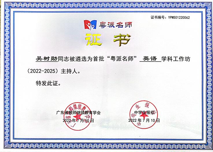 2022年7月,根据《关于开展首批“粤派名师学科工作坊”共建工作的通知》(粤教继学会【2022】8号)文件精神,经广东省教师继续教育学会与中学生报社共同组织专家评审,并经送外初审和“粤派名师”项目组复评,吴树勋老师被遴选为首批“粤派名师”英语学科工作坊(2022-2025)主持人。